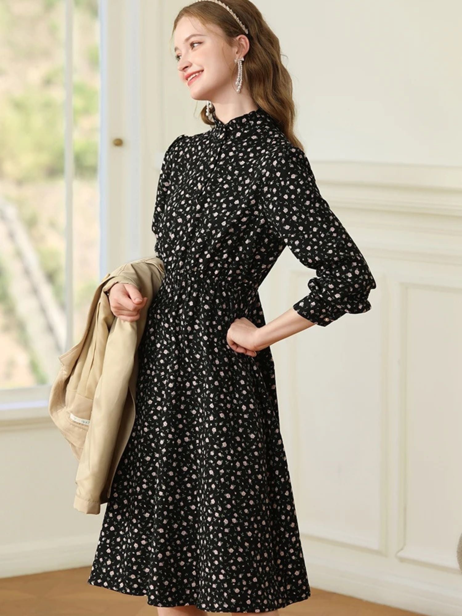 This floral French-inspired dress features a flattering high waist and an A-line silhouette. The knee-length skirt ensures a comfortable fit, while the floral print adds a charming touch. Made from a soft blend of polyester and spandex, it offers both comfort and lightness. With long sleeves and a subtle high collar, it's perfect for autumn outings.